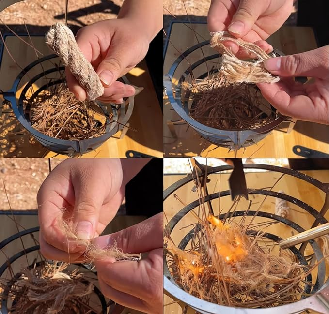 - 【Includes Waxed Tinder Cord – Thick or Thin Options】 Thick Rope (1.2" x 5.2"): 4 strands, ~15 min burn per strand Thin Jute Cord (0.3" x 1.2"): 20 pieces, ~5 min burn each All tinder is eco-friendly, odorless, and lights easily with a match or ferro rod.