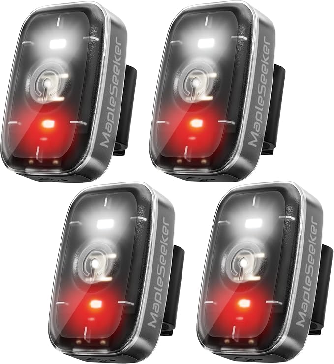- [Small Yet Strong] - Slim, lightweight, compact and super bright set of safety lights with 5 eye-catching lighting modes: white, white strobe, red, red strobe, red-white flash. It weighs 1/2 oz, you won't even know you're wearing it, but it’s made of high-quality plastic material and designed under Waterproof IP67, it can stand 10m height falling resistance and enable you to running or cycling in rainy nights without fears.