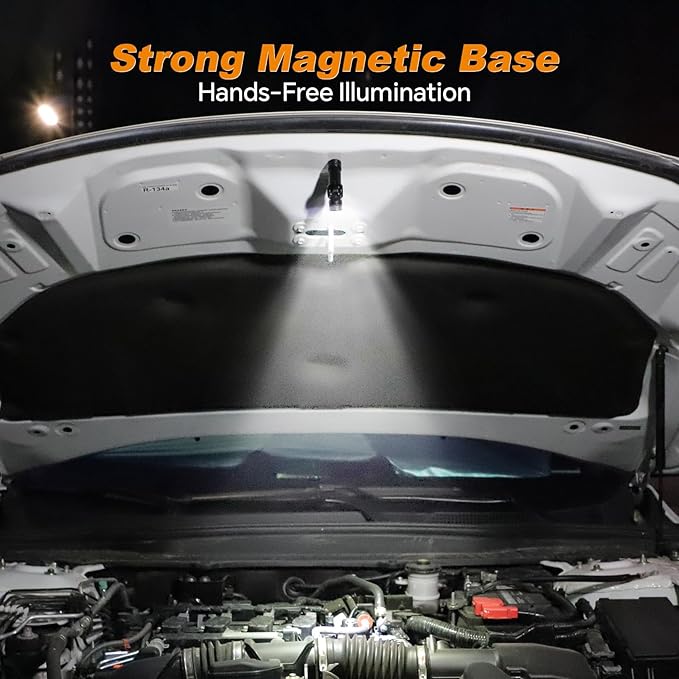 - Magnetic Tail Cap for Hands-Free Work – Strong magnets on the tail cap allow secure attachment to metal surfaces, keeping your hands free. Ideal for garage, workshop, car repair, or camping tasks, providing stable illumination in various working positions