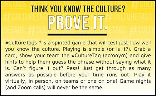 - HOW TO PLAY: Engage in lively gameplay, whether in person or virtually, by announcing the category and giving hints to guide others in guessing the CultureTag before the clock runs out