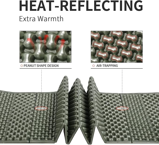 - 【Peanut Shape and Space Saving】Camping foam sleeping pad for camping features Peanut shape design and accordion-style design. Peaks and valleys work together to reinforce support capacity and trap nest one to another inside to save space when packed.