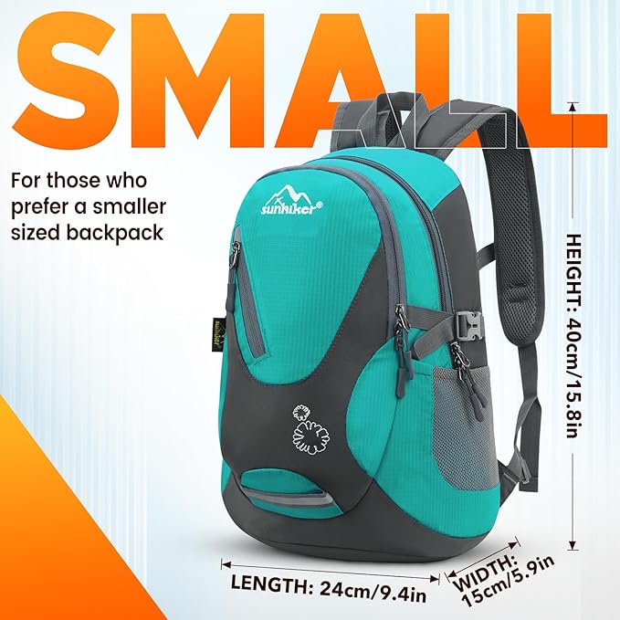 - IMPORTANT PRODUCT IMFORMATIONS: The sunhiker backpack is a small-sized backpack with dimensions of 15.8H x 9.4L x 5.9W inches/40 x 24 x 15 cm, a weight of 12.3 oz, and a capacity of approximately 20-25L. It is suitable for both men and women who prefer a smaller sized backpack and only want to carry essential items while traveling light. This size is also suitable for children above aged 3. Please make sure that it is the size what you need/want before purchasing.