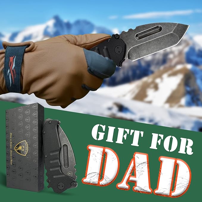 AUBEY Folding Pocket Knife with Tanto Tumbled 440C Steel Blade, Frame Lock, Black G10 Handle, Clip, Glass Breaker, Heavy Duty EDC Knife for Men Hunting, Magic Axe