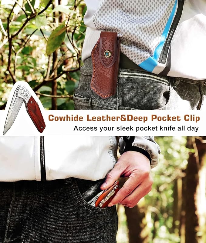 - ✅【Easy to carry】EDC pocket knife with pocket clip, frame with G10 lanyard loop, with leather case for everyday carry