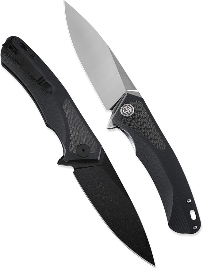 - 【Outdoor Folding Knife Materials】The blade is made of D2 tool steel with high wear resistance. After heat treatment, its hardness can reach 60HRC. It is a kind of steel suitable for practical use, which can meet any needs of people when camping or working. The handle is Carbon Fiber with G10 material with strong anti-deformation ability. It does not absorb water and will not be affected by moisture, so you never have to worry about the influence of water on the handle.