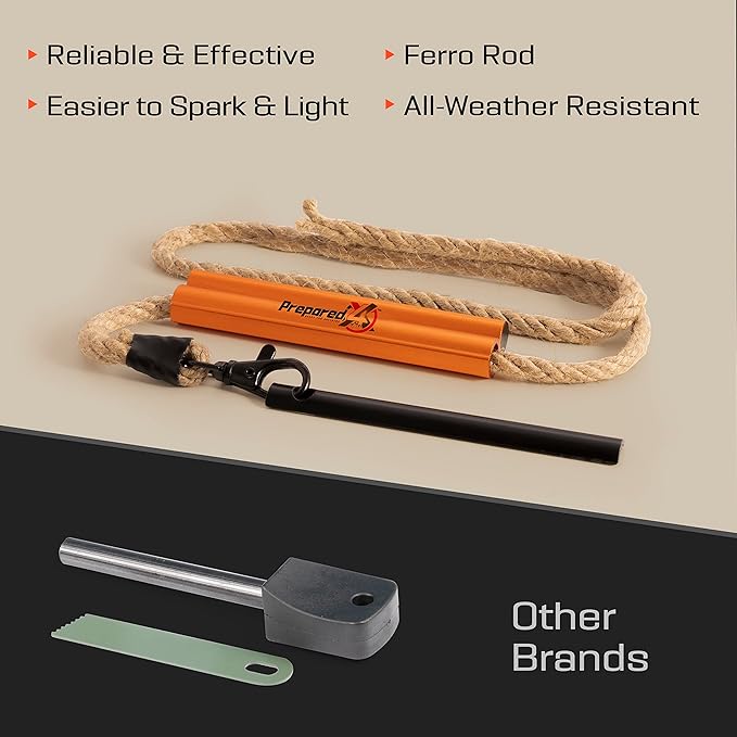 Fire Starter Survival Tool - All-in-One Flint and Steel Fire Starter Kit - Ferro Rod Fire Starter with 36" Waterproof Tinder Wick Rope and Steel Fire Striker - Patented Firestarter | Prepared4X