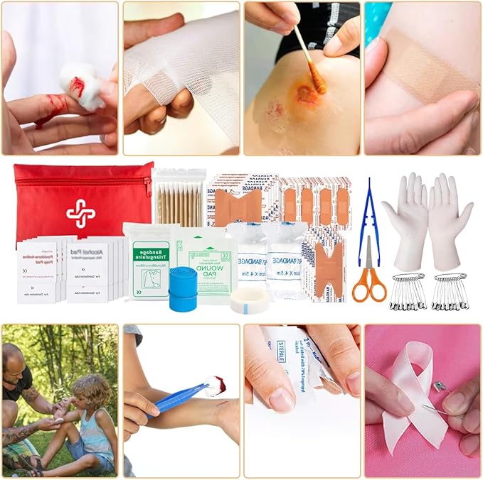 - [Basic First Aid Kit]: Designed to stow conspicuously, the included first aid supplies are packed in a extra bright red bag. It includes essential items such as tweezers, scissors and pins, would pad, bandage triangulaire, tournquet, cotton buds, a generous supply of bandages etc. Perfect for taking care of any medical or emergency needs during outdoor wilderness adventures or disaster.