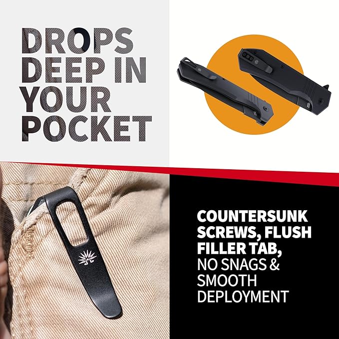 - ā¬ļøSTRONG DEEP CARRY CLIP: The Stinger XL will ride low in your pocket but always ready for quick deployment. The pocket clip has a perfect "swoop" design with three T6 clip screws for added strength, we made the screws on the clip flush with the handle, easy in and out of the pocket, no snags. **Also, after many requests, we added a G10 filler piece on the left carry side to keep the scales flush and smooth.