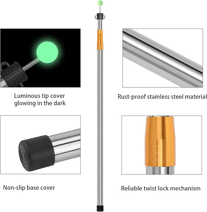 - 【Non-slip & Luminous】The metal tent tip with a removable newest luminous tip cover, glow in the dark, made of TPR insulation material, can prevent lightning strike. It can hold up the tent space when supporting the center of the tarp, effectively eliminating punctures while holding the tarp firmly in place to prevent collapse.