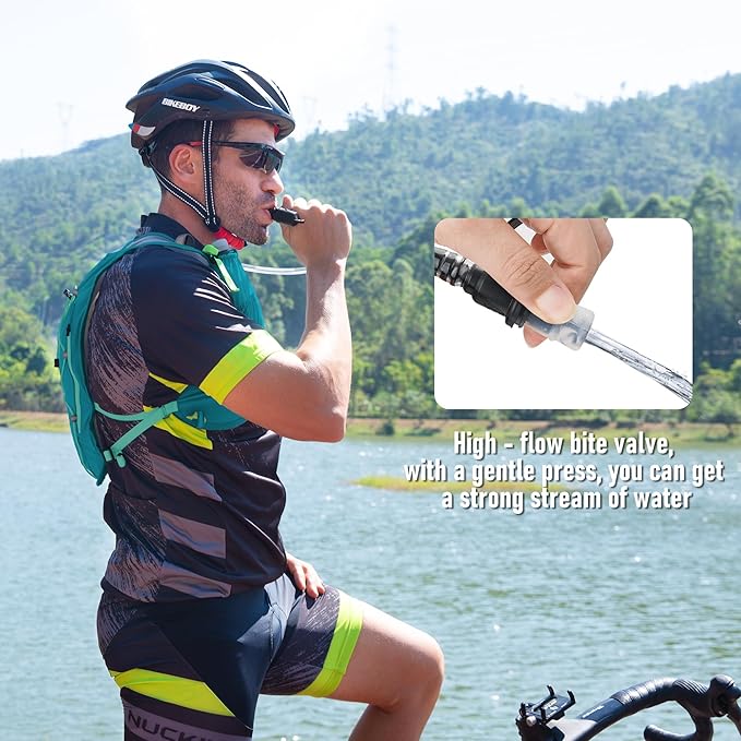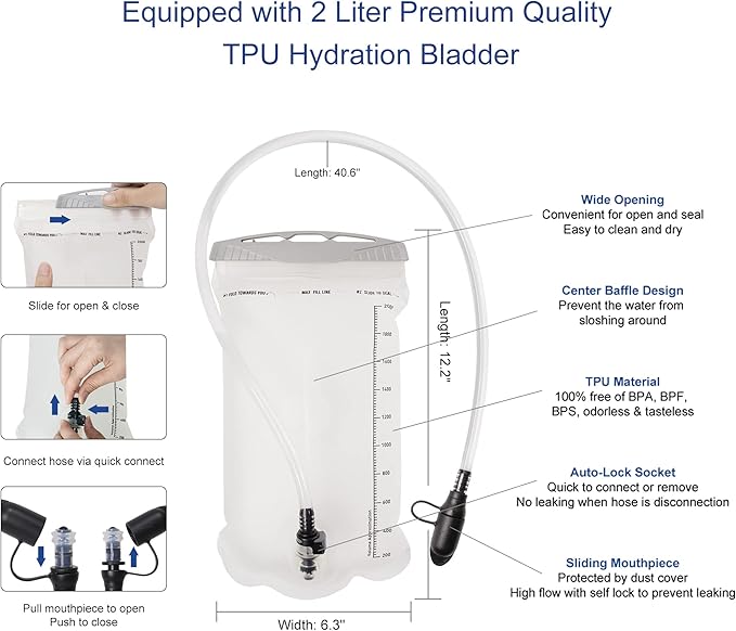 - 【Clean Hydration System】The hydration vest is equipped with a 1.5L PEVA leak-proof hydration bladder. The High-flow bite valve is protected by a dust cover, which prevents leakage and ensures water availability during off-road activities. Of particular note is the open/close switch on the bite valve, a clever design feature that prevents leaks. The Water Reservoir has a large enough opening to facilitate cleaning or adding ice cubes
