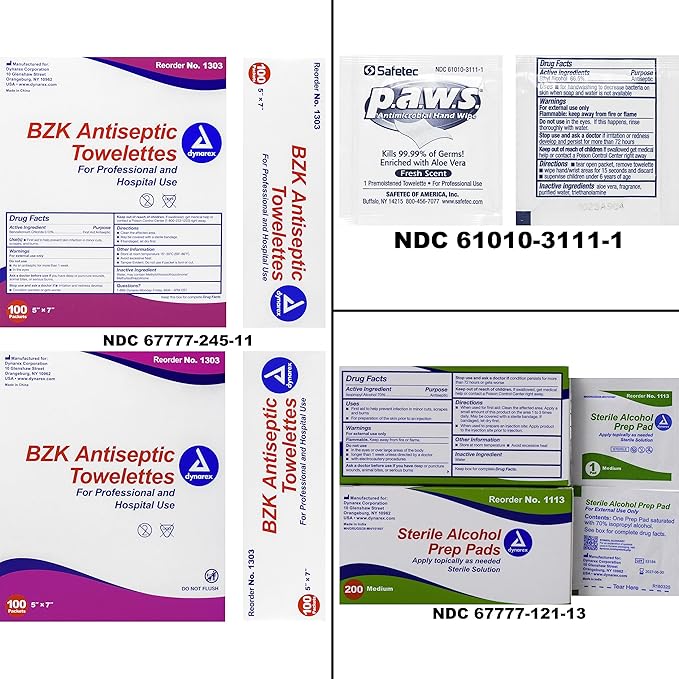 - Included Components : 1 Blood Stopping Bandage 1 First Aid Guide 4 Pair Nitrile Gloves 1 Tweezer 1 CPR Mask 1 Space Blanket 2 Triangular Bandage 1 Cold Pack 4 Antimicrobial Wipes 1 Biohazard Bag 2 Surgical Pads 5 x 9 2 Ammonia Inhalant Towelettes 1 Eye Wash 4 oz 1 Gauze Roll 2 Inch 1 Gauze Roll 3 Inch 1 Bandage Scissor 16 Fabric Bandages 1 x 3 3 Patch Bandages 3 Knuckle Bandages 3 Fingertip Bandages 3 Spot Bandages 5 Junior Bandages 3 Butterfly Bandages 2 Gauze Pads 2 x 2 2 Gauze Pads 3 x 3 2 Gauze Pads 4 x 4 2 Non Adhering Pads 2 x 3 2 Surgical Pads 5 x 9 2 Oval Eye Pads 1 Adhesive Tape 1/2 Inch 3 PVP Prep Pads 3 Antibiotic Ointment 3 Alcohol Prep Pads 3 First Aid Burn Cream 3 Hydrocortisone Cream 3 Antiseptic Wipes 1 Blood Stopping Bandage 1 First Aid Guide 4 Pair Nitrile Gloves 1 Tweezer 1 CPR Mask 1 Space Blanket 2 Triangular Bandage 1 Cold Pack 4 Antimicrobial Wipes 1 Biohazard… See more