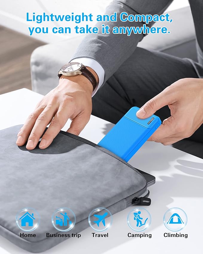 - [Super Slim]At only 0.5 inches thick and weighing only 223 g, this portable battery pack fits in any backpack, purse or work bag. Lightweight and compact, making it be a essential for business, travel, hiking and camping.