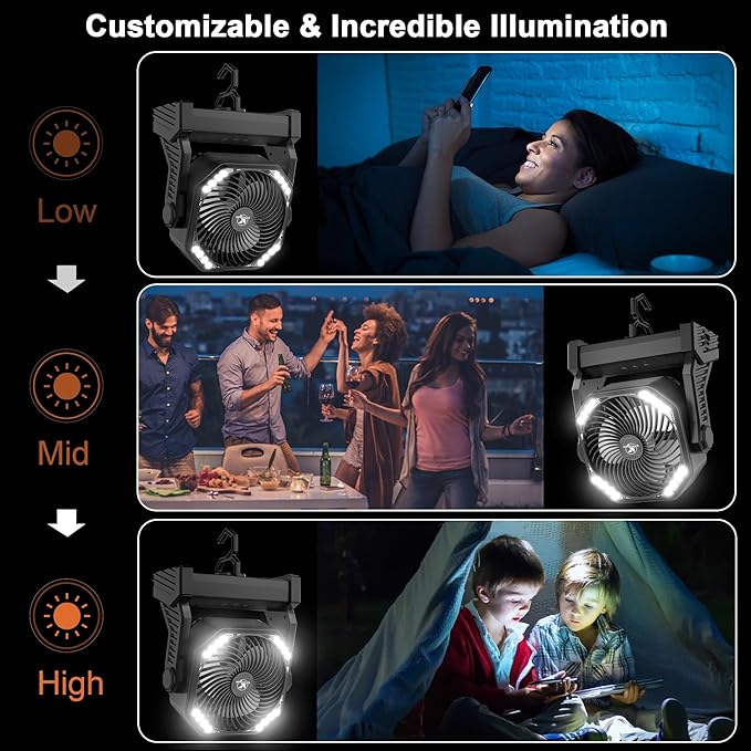 KITWLEMEN 20000mAh Battery Powered Camping Fan - 58H Max Cooling, Rechargeable Battery Operated Desk Fan with 4 Speeds, Bright Light & Hanging Hook, Portable for Tent Outdoor Hurricane Power Outage
