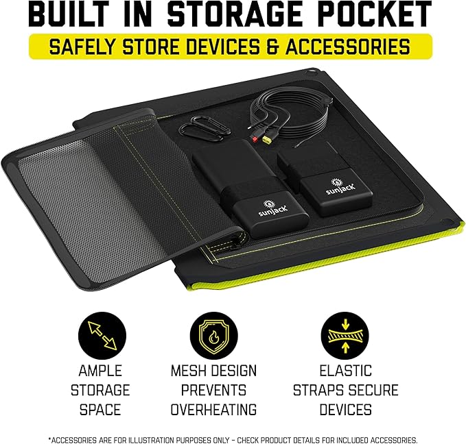- Foldable and compact, this laptop-sized foldable solar panel slips into any backpack, offering built-in mesh pockets and elastic straps to secure and protect devices during hiking, camping, or travel.