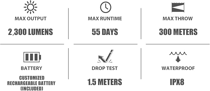- [๐ ๐ฎ๐ ๐ฎ๐ฏ๐ฌ๐ฌ ๐น๐๐บ๐ฒ๐ป๐ & ๐ฏ๐ฌ๐ฌ ๐ ๐ฒ๐๐ฒ๐ฟ๐ ๐ฅ๐ฎ๐ป๐ด๐ฒ] Equipped with a TIR optic lens, the flashlight delivers up to 2300 lumens, with a maximum range of 300 meters. Also, tactical switch comes with Strobe and Turbo