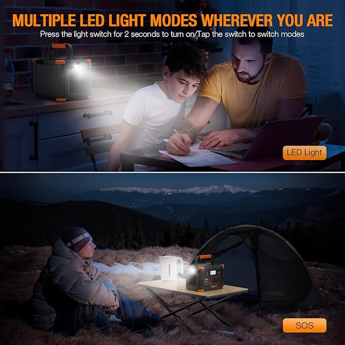 - Portable & Lightweight: With a lightweight 14.1lbs and compact size, GRECELL portable generator is customized for portable carry-on with a solid handle, making it easy and comfortable enough to be carried around for your outdoor camping, road trip, fishing, hunting, boating, RV trip, and indoor blackout. Besides, the built-in LED flashlight with light-strobe-SOS modes makes this power station with ac outlet convenient for outdoor activities and home emergencies (power outage, hurricane).