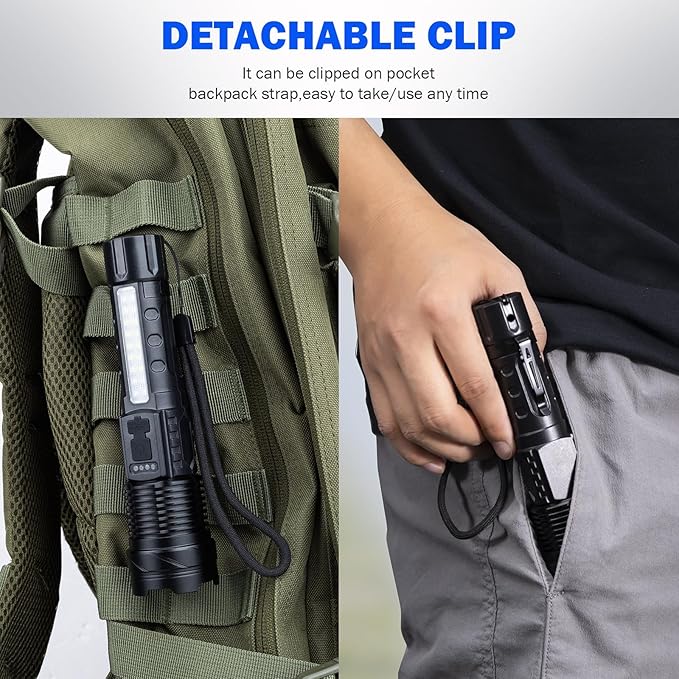 - 【Easy to Carry 】led flashlight is equipped with a lanyard, which can be hung on the side of the backpack or put into the backpack for easy carrying. flashlights also come with removable pocket clip, Easily attached to your pocket, hat, or belt.