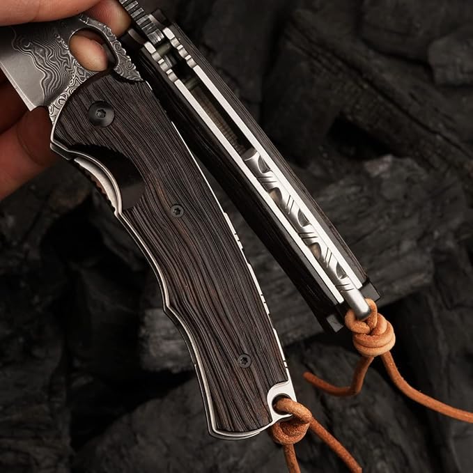 - [Beautiful Ebony Wood Handle]-Ergonomic handle gives you a comfortable grip and more saving effort.Liner lock prevents you from accident.It possess rapid one-handed deployment and is a friendly tool for high intensity operation.