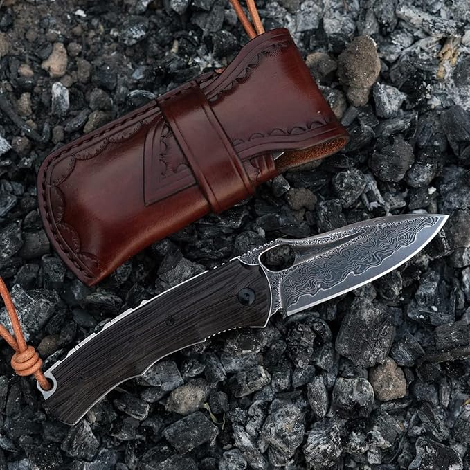 Folding Knife 3in Handmade VG 10 Damascus Steel Knife Pocket Knife, Leather Case, Ebony Handle, with Padded Lock, Suitable for Outdoor Camping Fishing and Carrying Knives