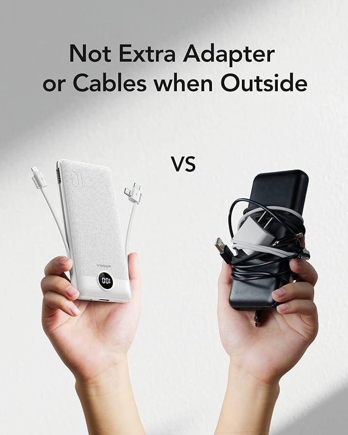 - 【Portable Charger for Multiple Devices】Designed for multiple devices, this portable charger features 4 outputs, including 2 cable outputs, USB-C, and USB-A outputs. Charge up to 4 devices simultaneously, and enjoy fast charging speeds of up to 15W with each cable and USB port output.