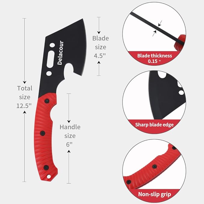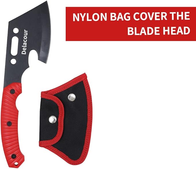 - 600D Oxford cloth sheath specifically tailored to Delacour’s hatchet head to ensure your blade stay sharp and your loved one and you stay safe. Multiple openings flaps allow you to quickly access and use your hatchet for camping and survival. Two adjacent hooking loops at the top of the sheath allow for it to be hung and secured regardless of orientation.