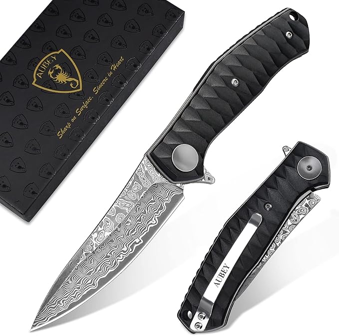 AUBEY Damascus Pocket Knife for Men with Clip EDC, 3.23" VG10 Core Damascus Steel Blade Folding Knife with Black Aluminum Handle, Sharp Camping Knife
