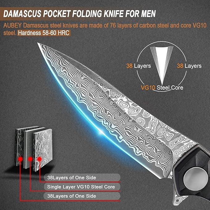 - Damascus Pocket knife: Made of 76 layers of high-quality carbon steel and core VG10 steel. After heat treatment, hardness 59-61 HRC offers excellent cutting performance and corrosion resistance and has an excellent performance in outdoor tasks.
