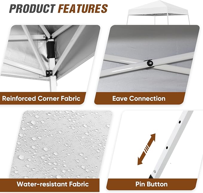 - EASILY ADJUSTABLE: The leg height has three settings to quickly adjust the canopy height and angle to maximize shade throughout the day. 64 square feet of shade, large enough for 5 people. (Slant leg design is 8'x8' at base and 6'x6' at the top)