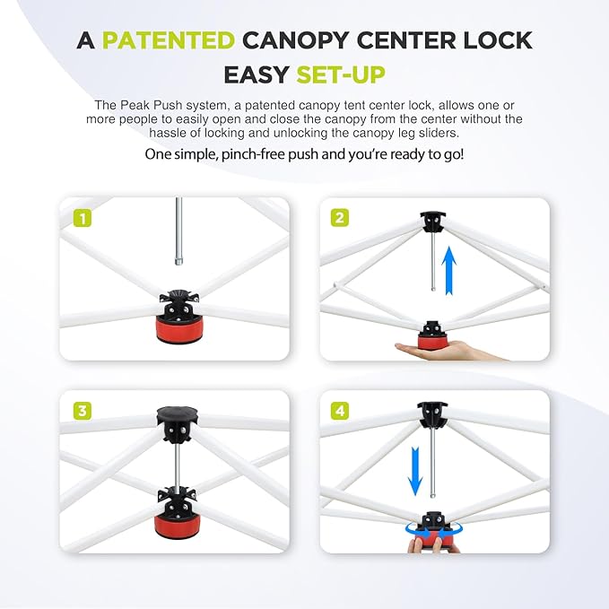 - EASY SETUP: Say goodbye to complicated setups; this easy setup pop up canopy tent features the Peak Push system, a patented canopy center lock. This portable canopy requires no tools and easily opens and closes from the center in seconds. Its unique canopy tent center lock enables a seamless, one person setup, letting you maximize outdoor time with minimal effort