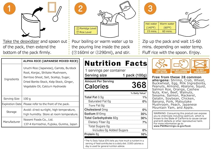 - MADE WITH 100% JAPANESE RICE: Gomoku rice is a classic Japanese rice dish with seafood stock. It contains mixed vegetables and mushrooms to create an umami-rich meal. Made of natural premium ingredients, pre-cooked, dehydrated, and packed in Japan.