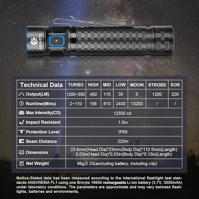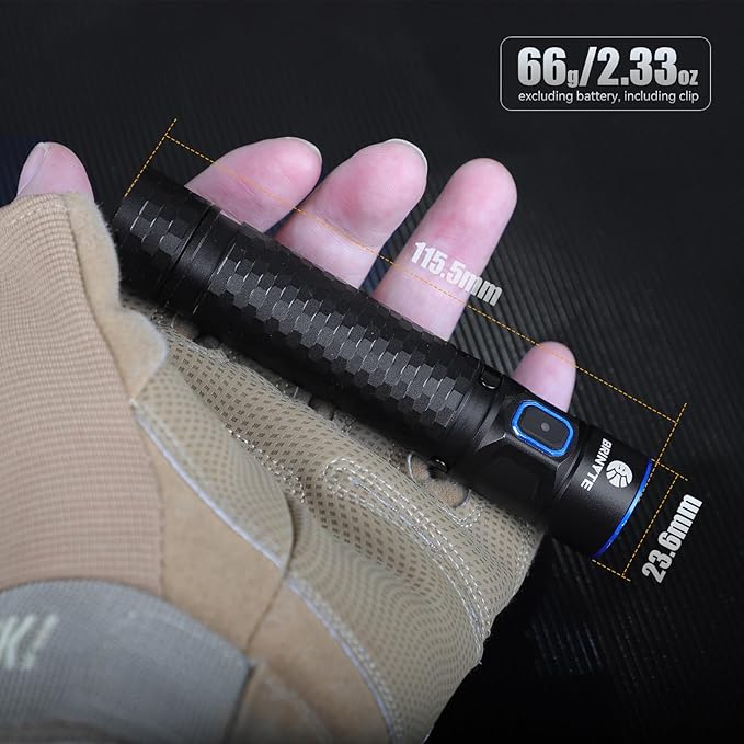 - Small Yet Powerful: The E18 powerful flashlight boasts a maximum brightness of 1200 lumens and a beam distance of up to 220 meters. With small size (0.92in x 0.90in x 4.54in) and light weight (2.33 oz) , the E18 pocket flashlight is a compact yet powerful EDC light.