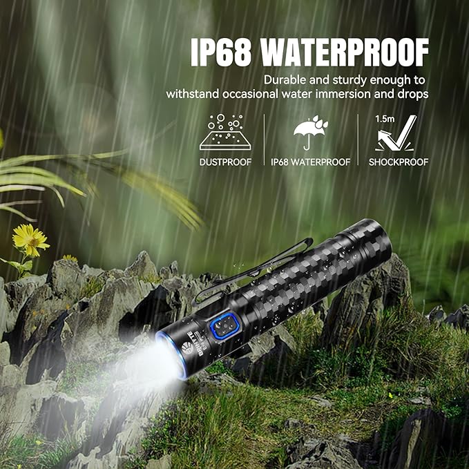- Durable and Tough: Constructed from aluminum AL-6061-T6 with a premium hard-anodized finish, the E18 pocket light is IP68 waterproof, shockproof, and abrasion-resistant, capable of withstanding various extreme weather conditions.