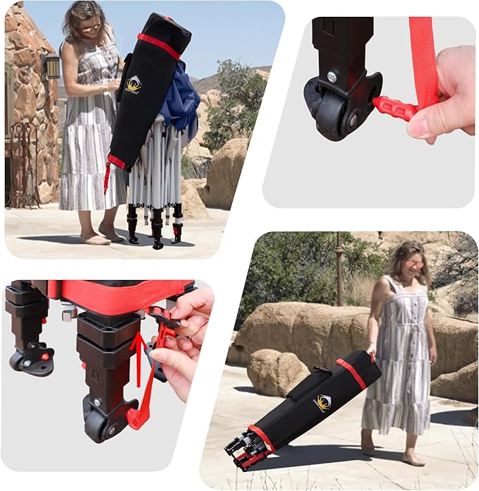 - STO’ N GO SYSTEM - Our lift-free system makes collapsing, storing, and transporting the 10x10 tent a breeze. The 10x10 tents can be stored with the fabric attached, with a specialized pocket for 4 sandbags, 8 stakes, and 4 guy ropes. Integrated wheels in the feet allow easy movement even when the instant shelter tent is set up, by simply lifting the side without wheels. This feature is especially useful for quick setup and takedown at locations like the patio or sports events