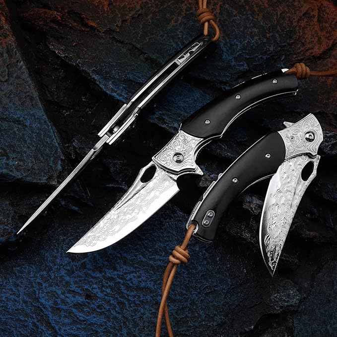 - [High performance blade] -- The blade core can reach 60-62 HRC, with excellent heat treatment performance. Double-sided carbon steel provides double protection. The surface of Damascus steel is polished, making it a good choice for camping.