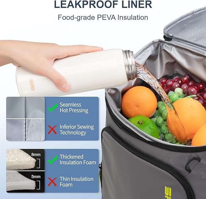 - Leak-proof Liner: Our cooler backpack liner adopts high-tech seamless hot pressing process for leak-proof; The zipper is not leakproof, please be careful not to tip over when using it.