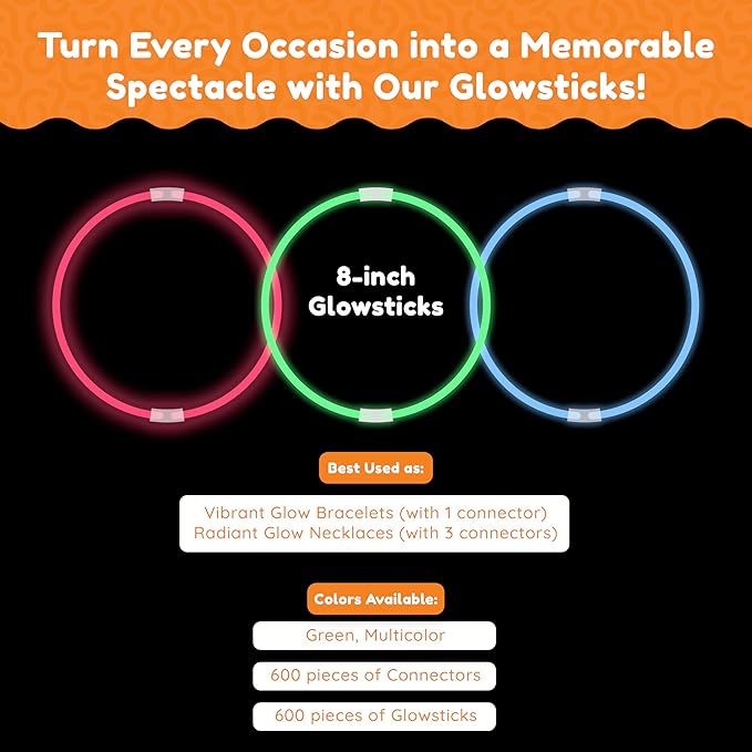 Glow Fever Glowsticks Bulk 1200pcs Party Pack includes 600 8" Glow Sticks and 600 connectors, Bracelets and Necklaces, DIY Costume , Light Sticks, for Concert, Wedding and Birthday, Multicolor