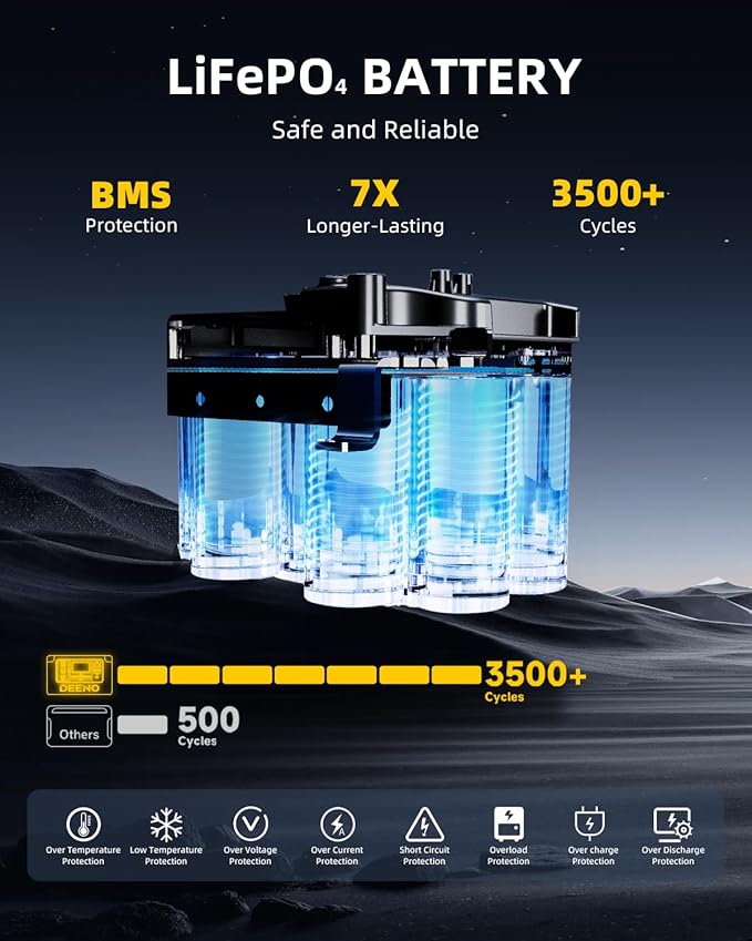 - Long Battery Life & Safe Usage: Featuring DEENO's exclusive Intelligent Battery Management System (DiBMS), this power station ensures safe operation by offering overcharge, over-discharge, short-circuit, and temperature protections. The LiFePO4 battery delivers over 3500 charge cycles, ensuring long-term reliability and cost-efficiency.
