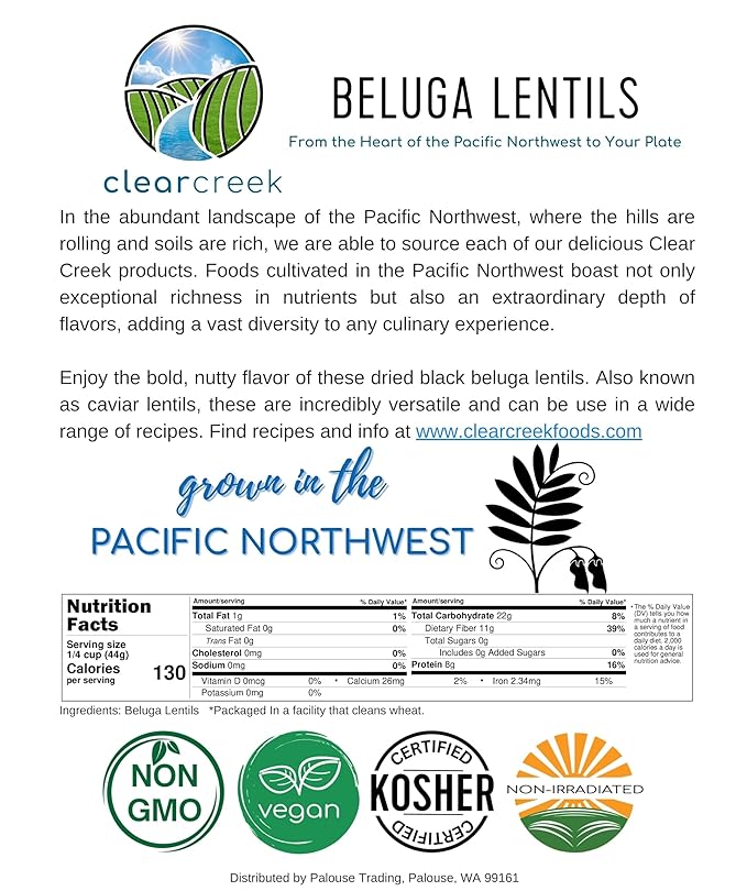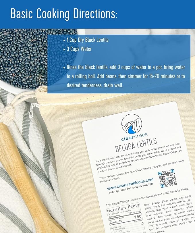 - EASY TO COOK AND DELICIOUS: Dry black lentils cook in 20 minutes, with no soaking required. If you are looking for a shorter cook time, you can soak them first. With a deep, nutty falovr, Clear Creek black lentils are perfect for adding to soups, salads, casseroles, tacos, and more.