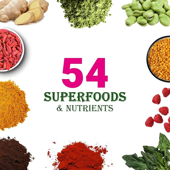 - π±π° π¦π¨π£ππ₯ππ’π’ππ¦ ππππ‘π: Containing 54 superfoods, like alfalfa, broccoli, brussels sprouts, kale, black currant, spinach, blueberry, goji berry, raspberry, and seabuckthorn, rich in various vitamins, minerals to supports immune system health