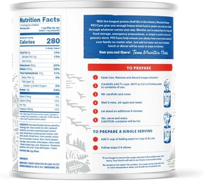 - DELICIOUS MEAL! A classic chicken and noodle dish in a savory cream sauce with mushrooms, celery, and green peppers. Freeze-dried to lock in nutrients and freshness. No refrigeration needed. Case contains six #10 Cans.