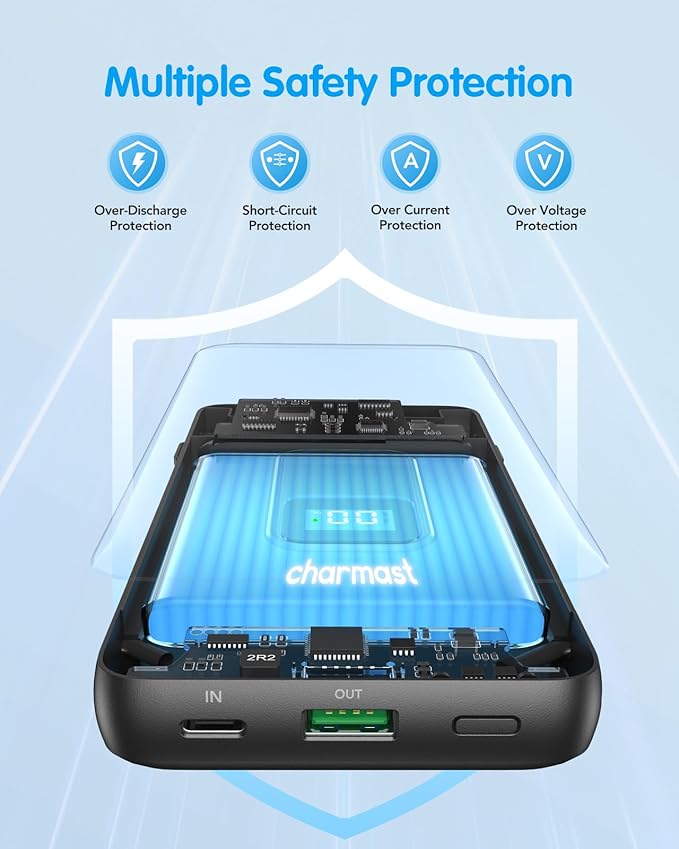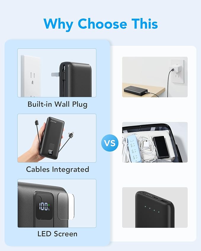 - Portable Charger with Built-in Cables and Wall Plug: Two cords and wall plugs integrated allows the Charmast power bank to be compatible with all cellphones, so you don't need to bring extra chargers or get frustrated with a tangled mess of wires.