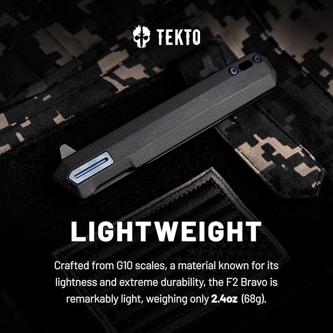 - LIGHTWEIGHT DURABILITY: Weighing a mere 2.04oz (68g), the TEKTO F2 Bravo is a featherweight champion crafted from the finest materials. Choose between Forged Carbon and G10 handle options, both renowned for their lightweight and extreme durability.