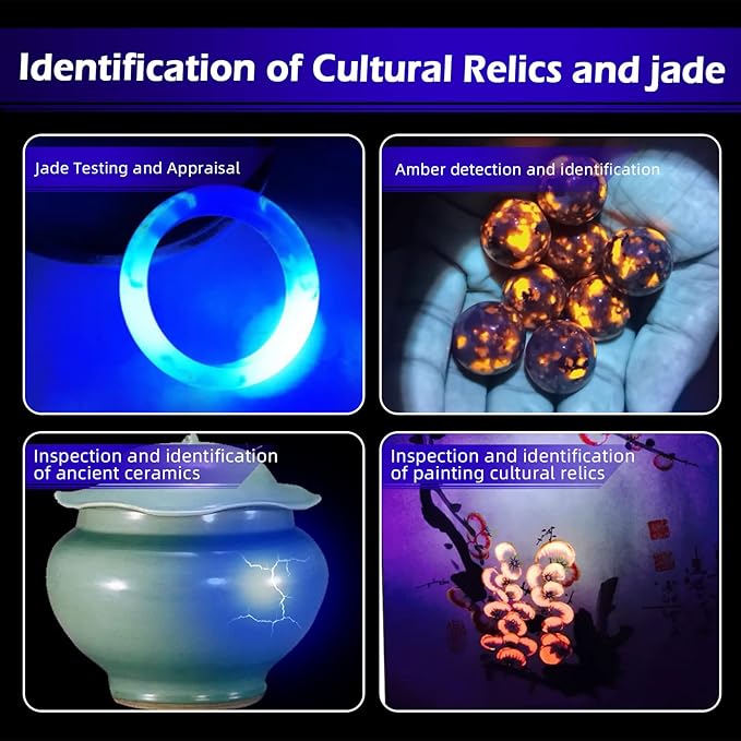 - In Folk Applications, Jewelry, Ore, Antiques, Art Coin Detection and Identification, Pet Urine Stains, Stains, Fluorescent Agent Detection, Mold and Other Biological Detection, Etc. People also Like It, Because of its Uniform UV Light Characteristics, No Stray Light Interference, so that People can More Accurately Identify the Subtleties.