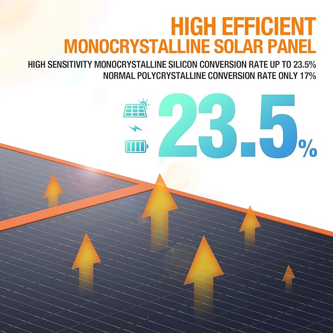 - High Cell Efficiency - Up to 23.5%: 200W solar panel, covered by monocrystalline silicon solar cells, conversion rate up to 23.5%, normal polycrystalline conversion rate only 17%, much higher efficiency than other normal solar panels.