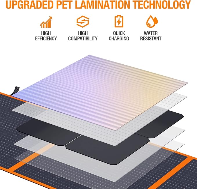 - Upgraded PET Lamination Technology: EBL 200W solar panel is made with upgraded PET lamination technology and high quality 840D Oxford cloth outer, designed with water proof protection, durable and wear-resistant.