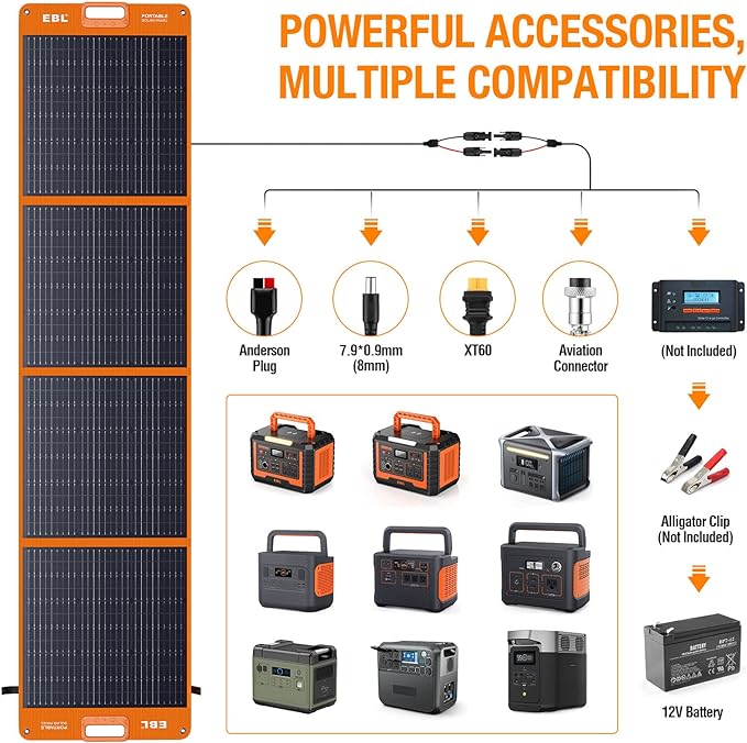 - Wide Range of Compatibility: Comes with a MC-4 to 4 in 1 solar charge cable( XT60 Connector, Anderson Connector, DC79*09mm Connector, Aviation Connector), compatible with almost all solar generators, such us Jackery, BLUTTI, Anker, EF ECOFLOW and many other power stations, also, especially excellent for EBL portable power stations.