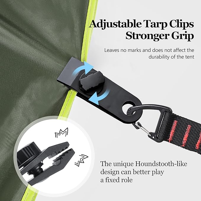 - [Multipurpose Usage]:Multipurpose Suction Cup Hooks can hang almost anything,towels, toys, bath robes, squeegees, kitchen tools etc.New set come with 4 pcs high quality tarp clips,more suitable for outdoor travel,Truck Camping,Suv Tent, etc., very suitable for family picnic and outdoor activities.