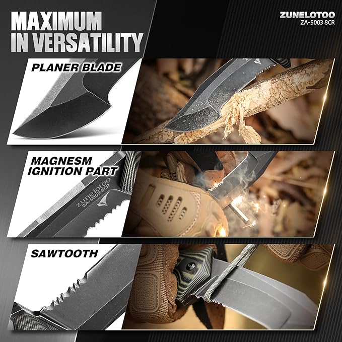 - 3.85" sharp clip point fixed blade knife: This tactical hunting knives made of 8Cr14mov, which offers excellent hardness, better edge maintenance, and rust resistance. It comes super sharp right out of the box.