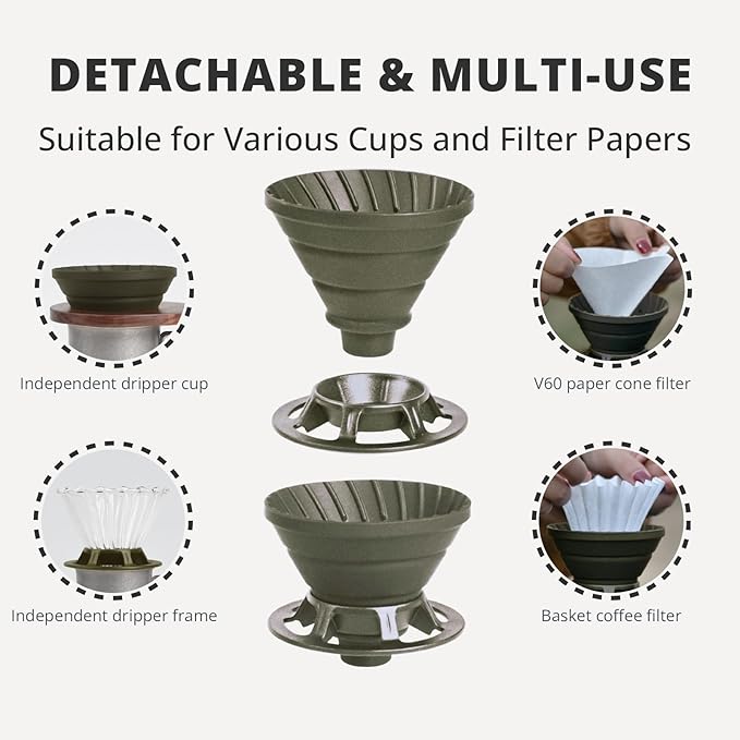 - EASY TO STORE AND CARRY: The coffee dripper is lightweight and collapsible. The foldable design can save a lot of space. It is only 1.1"H after folding, which is easy to store and carry. Perfect for your camping, travel, business trip, home and office.