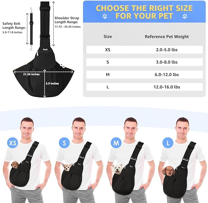 - Suitable for Different People --- The shoulder strap is adjustable from 17.72 inch to 35.43 inch, which can be customized to the most suitable length for different height. And its width is 3.15 inch, and contains thick sponge which relieving your shoulder pain effectively. Suitable for small pets weight up to 16lbs, the most suitable weight: 12-16 lbs. The material of this carrier is relatively soft. Add a light blanket on buttom to make your dog more comfortable when lying down. You can check the buyer-submitted photos to see how dogs look and feel while in the sling.